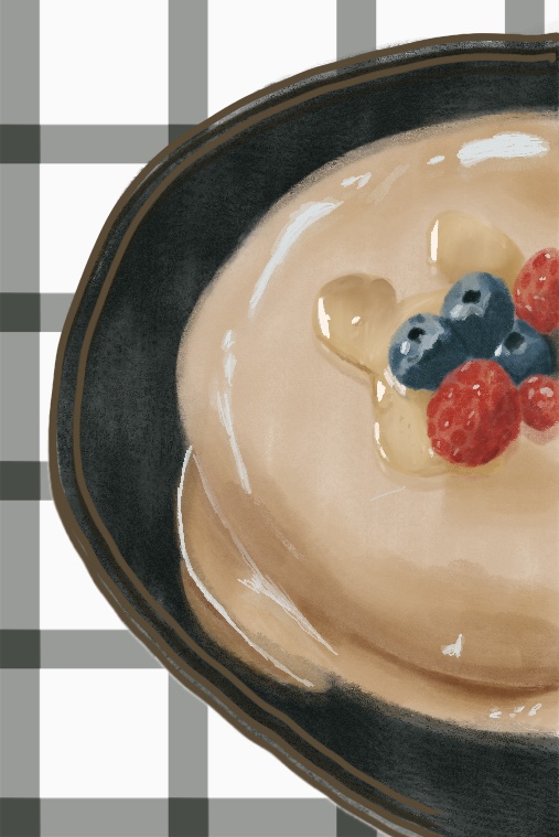 再來就開始畫鬆餅,我們要先用水粉畫的筆刷,用顏色最淺的咖啡色畫出鬆餅🥞,再用深一點的咖啡色畫陰影的地方,再用更深的咖啡色畫陰影,注意這個陰影就要畫的進去一點,然後再用更深的咖啡色來畫最後的陰影,這個可以多畫幾次來增加深度,最後用偏咖啡色一點的白色來畫鬆餅上的光澤,光澤是用光譜筆刷畫的,光澤可以用圖片參考來畫。
