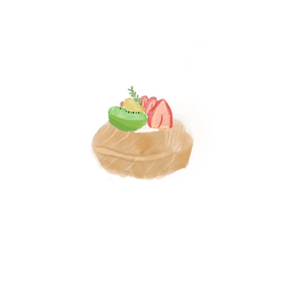 這張應該就可以看出來我有所進步吧!我畫了很多細節,這張我有參考一張鬆餅的照片來畫。我來介紹一下他吧!