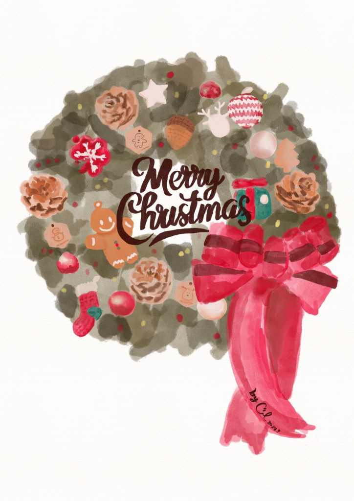 這張是我花三天完成的聖誕花圈!我用光譜筆刷畫的。裡面有很多的裝飾是要用陰影的,我用了很多塗層去畫。其中我覺得最難畫的應該是那四顆松果,祝大聖誕節快樂🎄!!!!!!