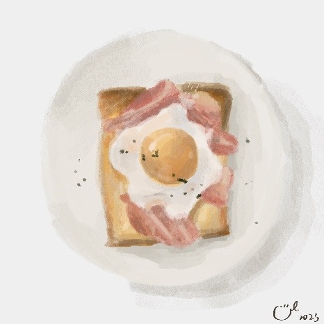 我畫了一個看起來好吃的培根蛋吐司,我以後會用平板上的「螢幕錄影」紀錄我畫畫的過程,之後再加速影片。